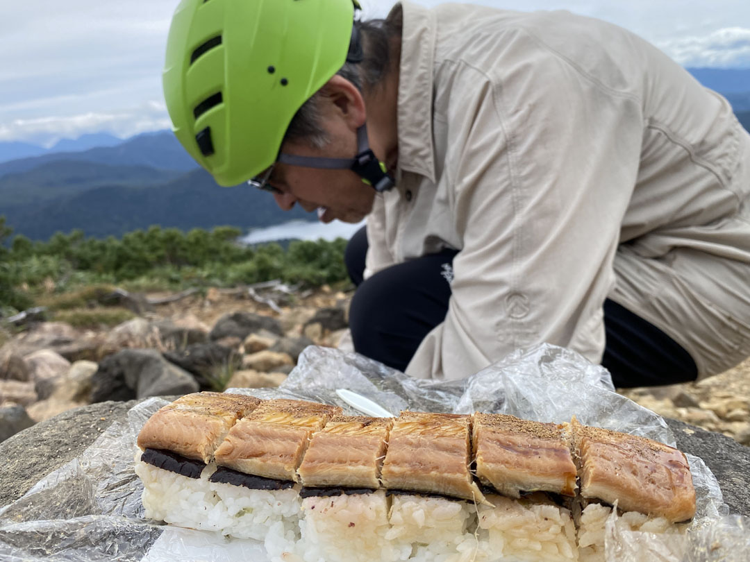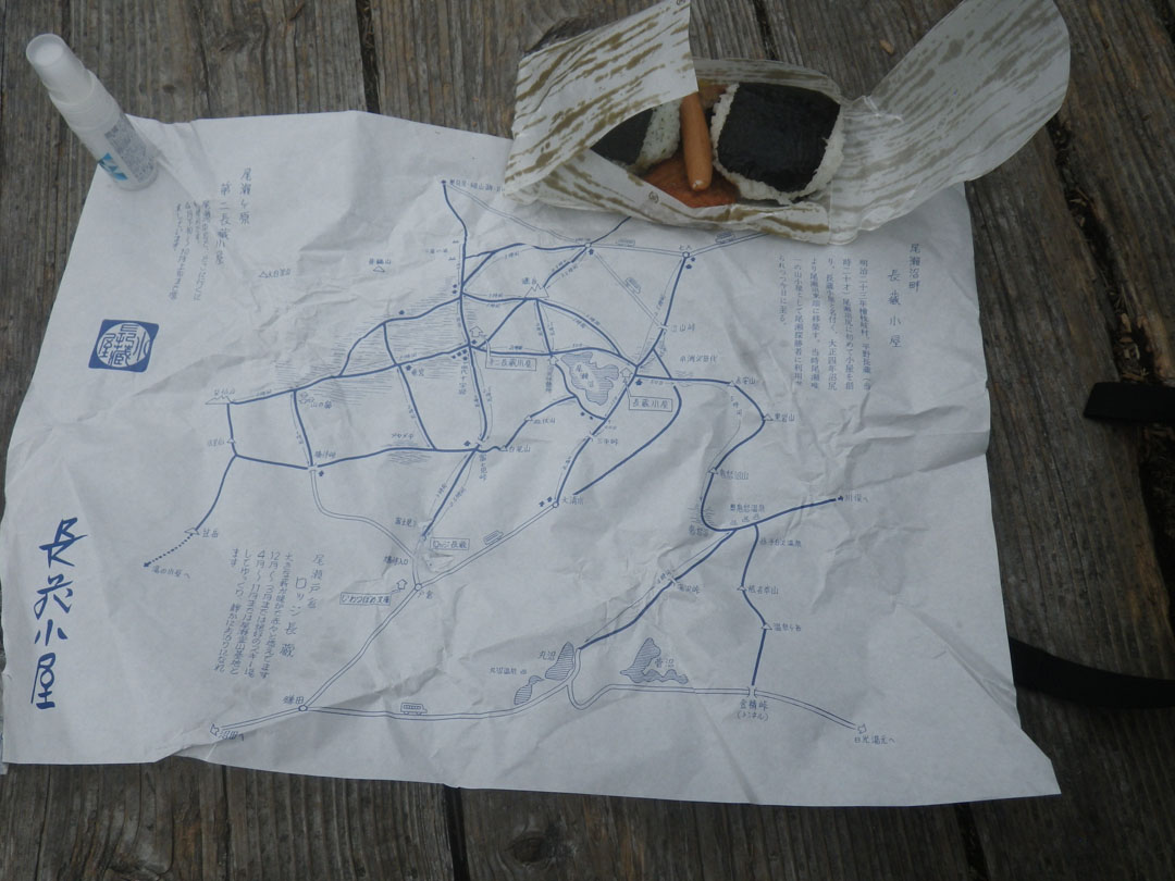 牛首で昼ご飯。長蔵小屋で朝ごはんの分をお弁当にしてもらいました。包み紙が地図、とは憎いです。 #包み紙が地図 |